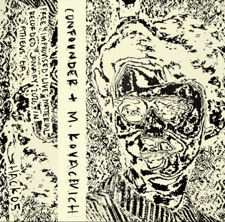 "Short-form, live free improvised material recorded January 2026 in Athens, Ga. A spiraling void of texture and tone. The first collaboration between Confounder and M. Kovacevich brings the listener in contact with some of the deepest feelings of anxiety and cosmic dread. Made up of field recordings processed and digitally sampled; alongside radical prepared turntables. It's both at times claustrophobic and energetically powerful. The familiar, almost living sounds blending with a wide variety of noise."